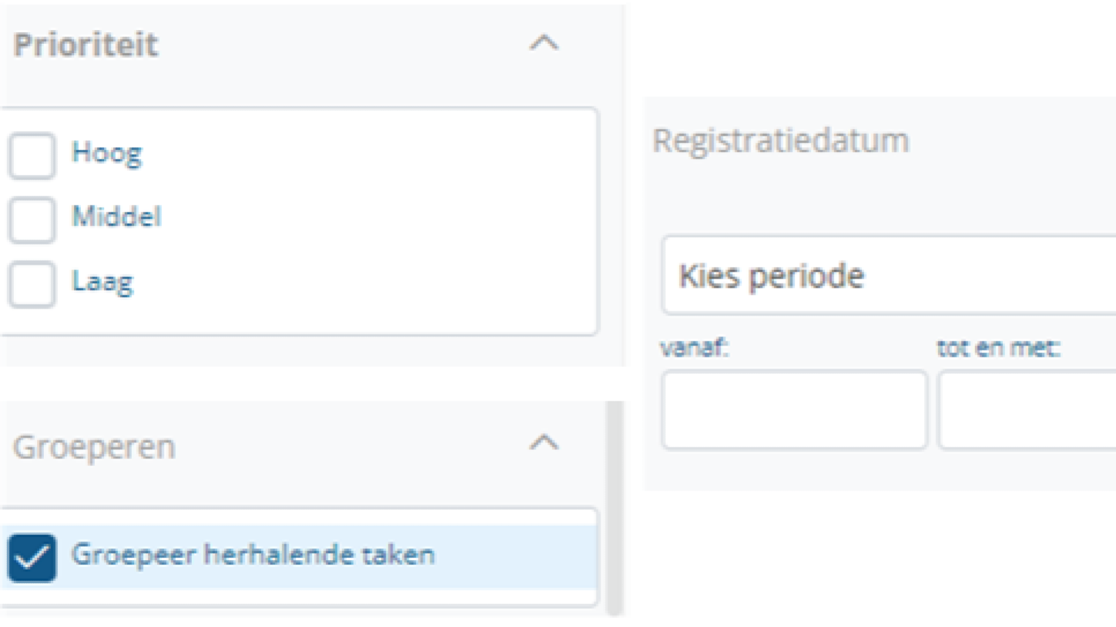 - Alle vormen van taken zijn nu zichtbaar en filterbaar in dit scherm, inclusief de taken zonder opvolging.